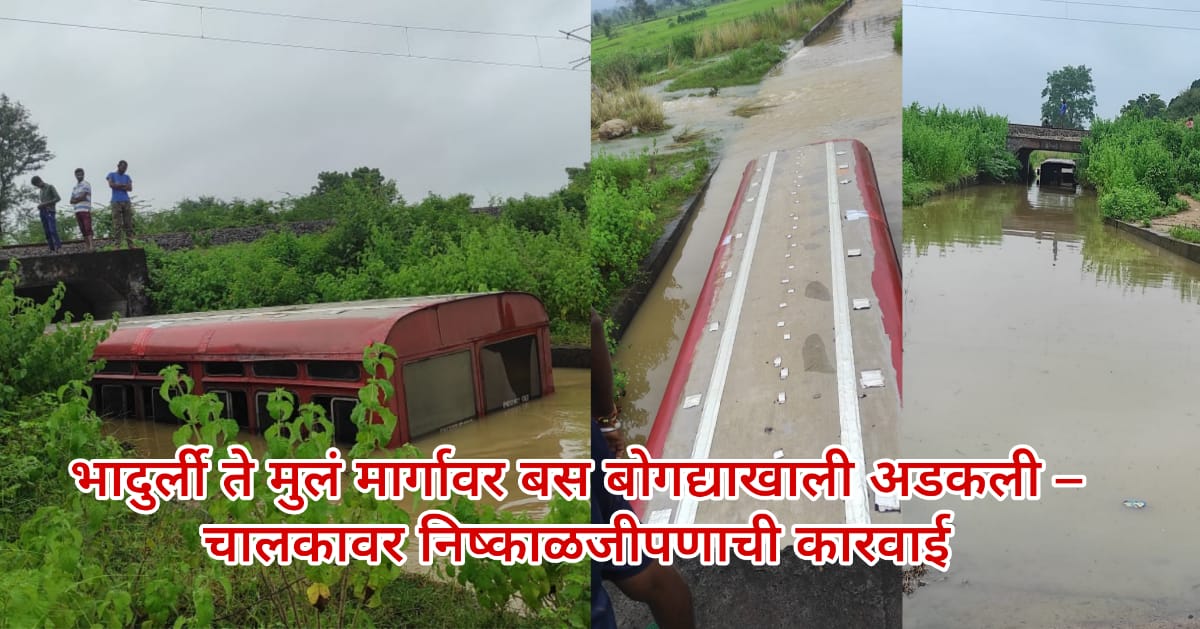 चंद्रपूर, दि. 12 सप्टेंबर 2025 – भादुर्ली येथून मुलंकडे जाणारी चंद्रपूर आगाराची बस (क्रमांक MH40 N 9426) दिनांक 12 सप्टेंबर 2025 रोजी सायंकाळी अंदाजे 6.15 वाजता रेल्वेपटरीखालील बोगद्यात अडकली. बोगद्यात अंदाजे एक ते दोन फूट पाणी असल्याने बस निघेल असा समज करून चालकाने गाडी पुढे नेण्याचा प्रयत्न केला. मात्र, बसचा सायलेन्सर पाण्याला लागल्याने इंजिन बंद पडले. त्यानंतर पाऊस वाढल्याने बोगद्यात मोठ्या प्रमाणावर पाणी साचले आणि गाडीच्या रेडिएटरपर्यंत पाणी पोहोचले. परिणामी बस अडकून राहिली.