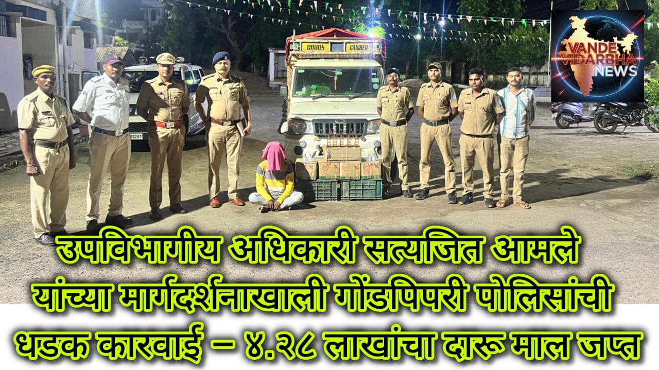 यावरून गोंडपिपरी पोलिसांनी तातडीने शिवाजी चौक येथे नाकाबंदी केली. त्यावेळी संशयित बोलेरो वाहन दिसून आल्यानंतर त्याची पंचासमक्ष तपासणी करण्यात आली. पाहणीदरम्यान वाहनातून देशी दारू संत्रा ९० एम.एल.च्या ४०० बाटल्या (किंमत १६,०००/- रुपये) आणि रॉयल स्टॅग १८० एम.एल.च्या ४८ बाटल्या (किंमत १२,०००/- रुपये) असा अवैधरित्या दारू माल आढळून आला. तसेच वाहतुकीसाठी वापरलेले बोलेरो वाहन (किंमत ४,००,०००/- रुपये) असा एकूण ४,२८,०००/- रुपयांचा मुद्देमाल जप्त करण्यात आला.