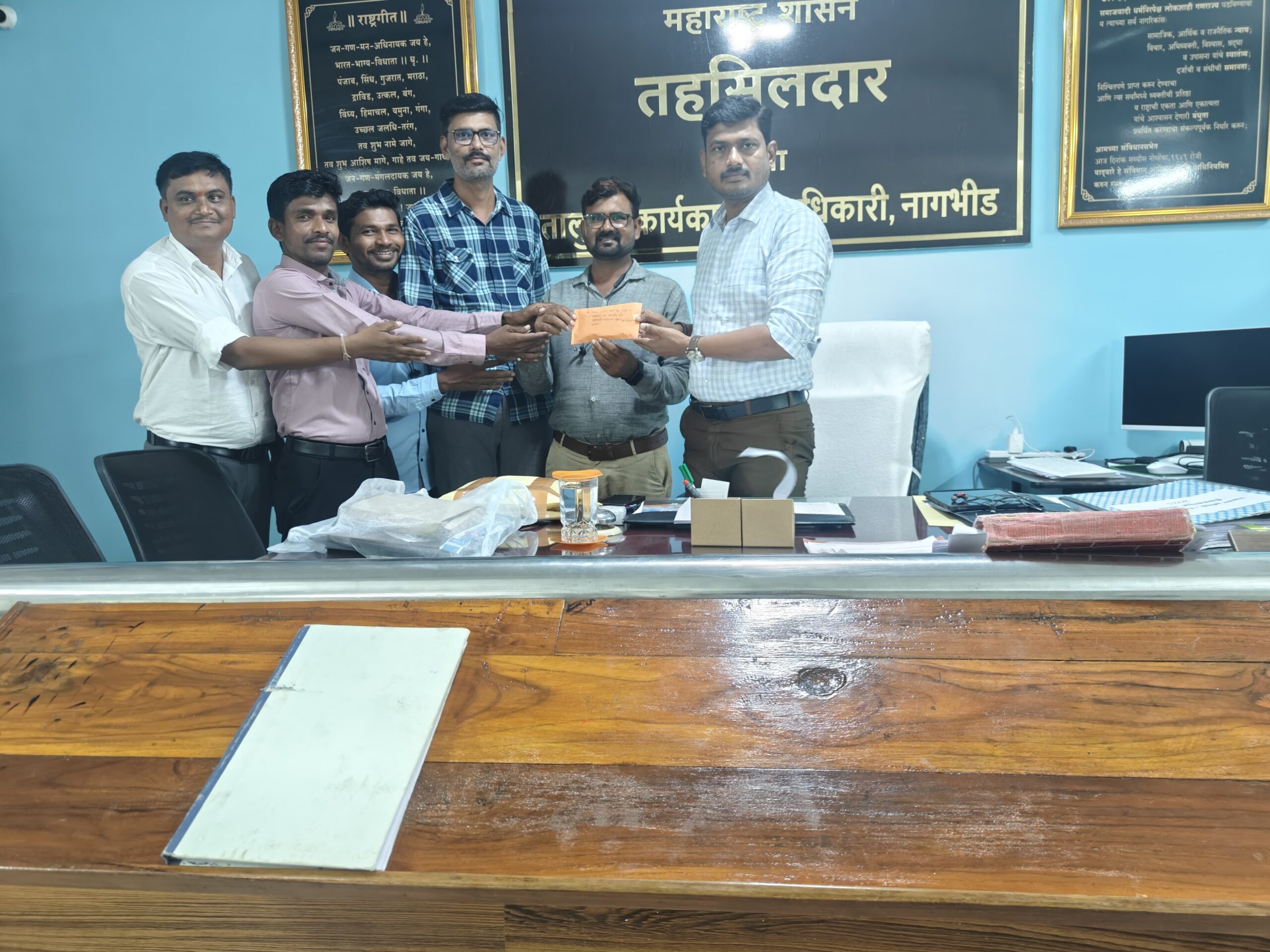 नागभीड पूरग्रस्त मराठवाडा येथील बांधवांच्या मदतीसाठी नागभीड तालुक्यातील ‘आपले सरकार सेवा केंद्र चालक संघटना’ पुढे सरसावली आहे. सामाजिक बांधिलकी जपत, ही संघटना आज दिनांक ८ ऑक्टोबर २०२५ रोजी मुख्यमंत्री सहाय्यता निधी (पूरग्रस्त मराठवाडा) करीता आर्थिक मदत मा. तहसीलदार प्रताप वाघमारे, नागभीड यांच्या हस्ते सुपूर्द केली.